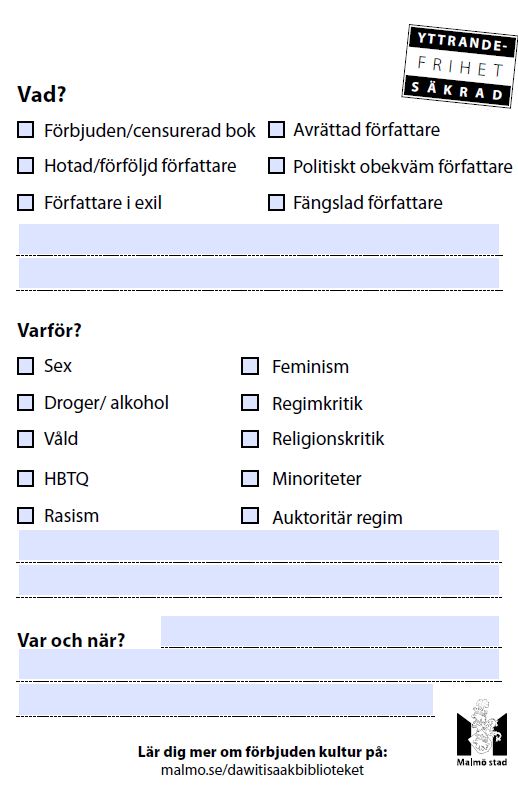 Exlibris är den etikett som finns i pärmen av varje bok. Här får läsaren reda på när och var boken har förbjudits, vad anledningen angetts vara och vad påföljden var för författaren.