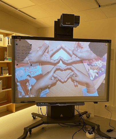 En stor skärm på hjul visar en bild av händer som formar hjärtan. Skärmen står i ett rum med bokhyllor i bakgrunden.