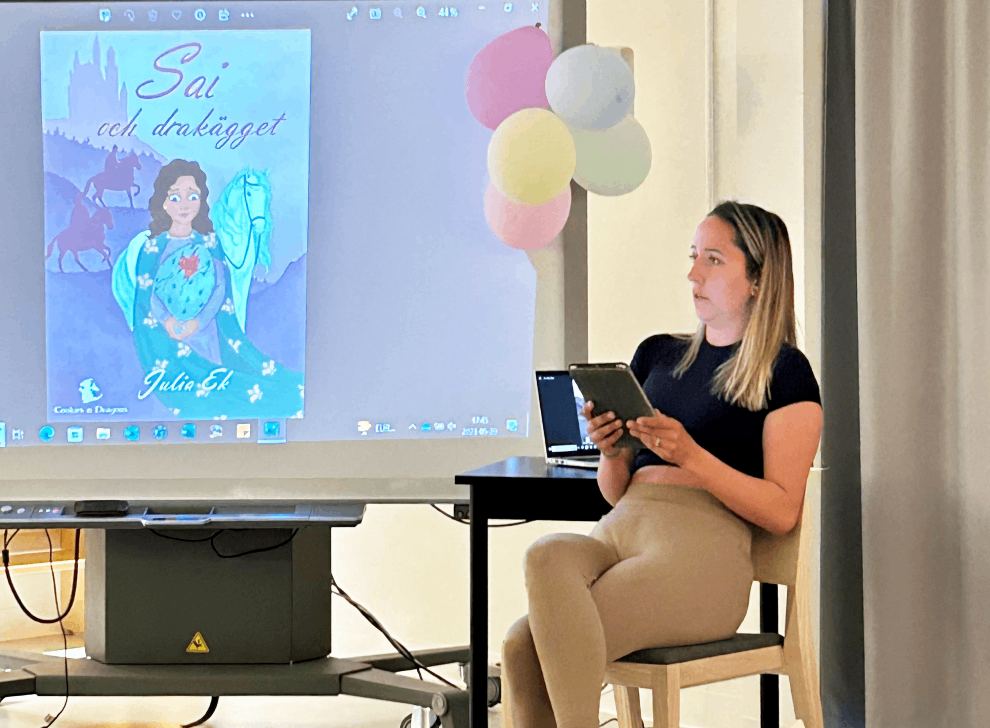 En person sitter och håller en surfplatta framför en stor skärm som visar omslaget till barnboken "Sai och drakägget" av Julia Ek.