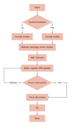 Algoritmer jämförs ibland med recept som beskriver i vilken ordning ingredienser ska föras samman och hur de ska hanteras för att uppnå ett resultat. Om vi tar metaforen vidare bestämmer de olika valen som görs vilken kaka det i slutänden blir. Valen avgörs av en rad omständigheter. Vilka omständigheter som ska leda till vilka val är det som beskrivs i en algoritm.