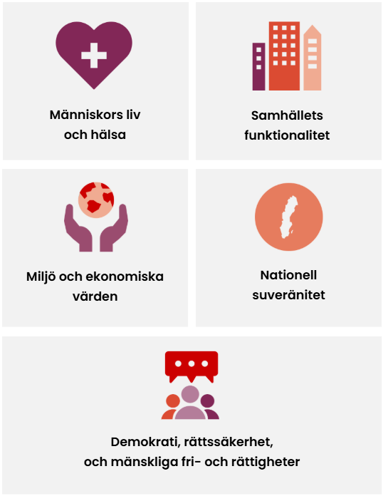 I kursen presenteras grundläggande värden som samhället behöver skydda, dessa har MSB delat in i följande fem kategorier: