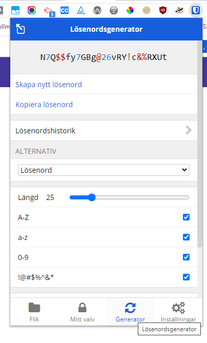 Jag väljer “Generator” som genererar ett lösenord. Digiteket kräver specialtecken för att acceptera lösenordet så jag markerar också boxen med specialtecken. Jag ställer in lösenordslängden på 25 tecken, längden spelar ingen roll, jag kommer aldrig ange detta lösenord manuellt utan Bitwarden sköter detta framöver åt mig.