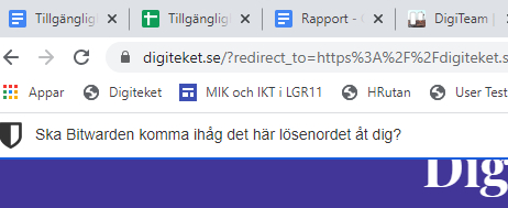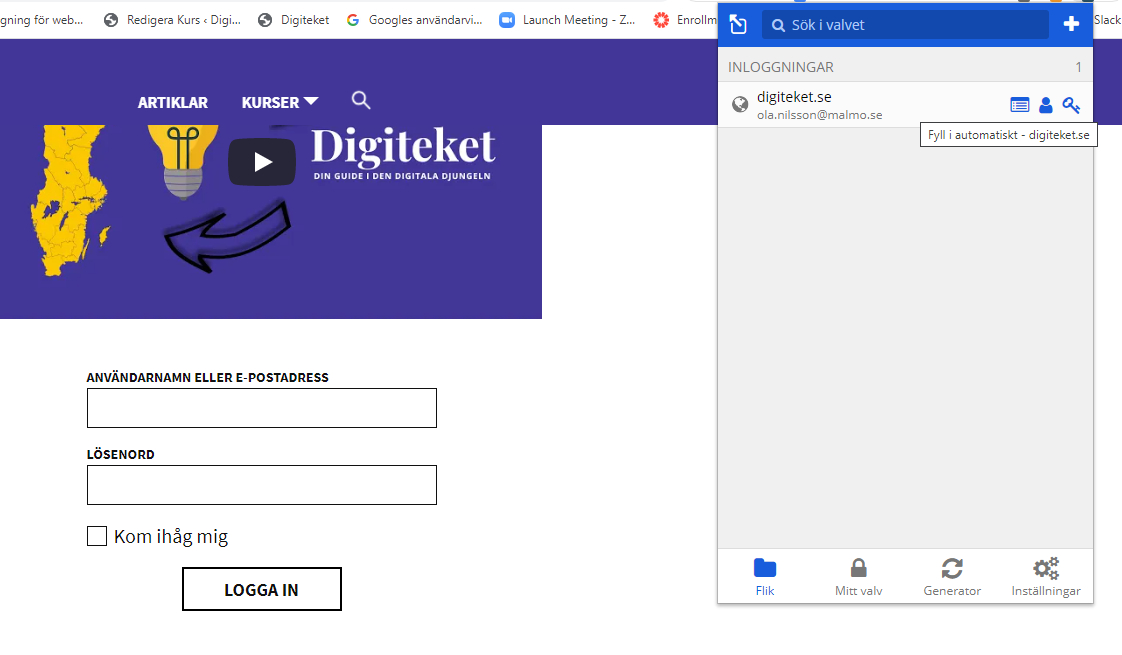 Jag går till lösenordsbytarsidan på tjänsten, i detta fall Digiteket, och klickar på Bitwarden-tillägget uppe till höger.