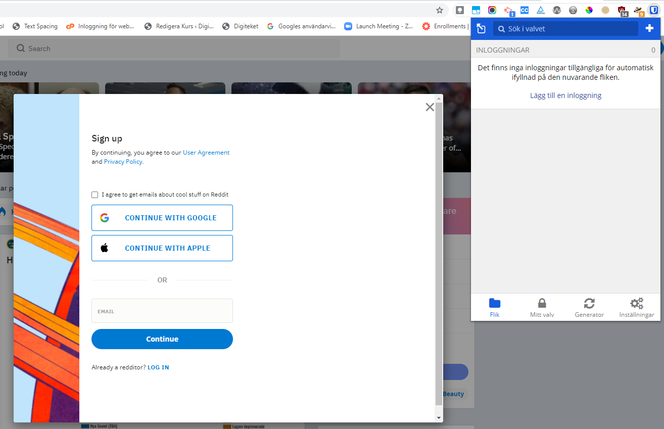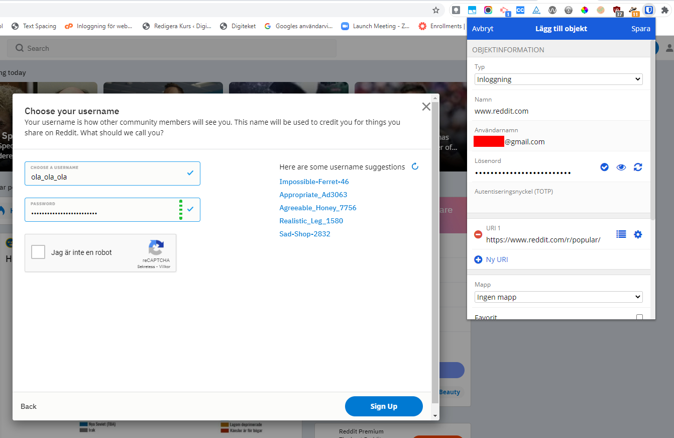 När du registrerar dig på nya tjänster kan du lika väl använda lösenordshanterarens förtjänster direkt. I exemplet nedan registrerar jag mig på internetforumet Reddit, men principen är samma som på alla nättjänster, från Blocket till Twitter.
