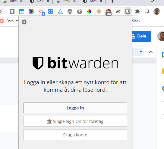Klicka sen på Bitwarden-logotypen uppe i högra hörnet och logga in på ditt konto.