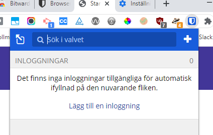 När du besöker en tjänst som du redan är registrerad på så väljer du att klicka på Bitwarden-tillägget uppe i högra hörnet och sen ”Lägg till en inloggning” och registrerar ditt nya lösenord i valvet. Är du som jag och använder samma lösenord till en mängd olika tjänster? Passa då på att skapa ett unikt och svårknäckbart säkert lösenord så att du nyttjar lösenordshanterarens styrkor till fullo.