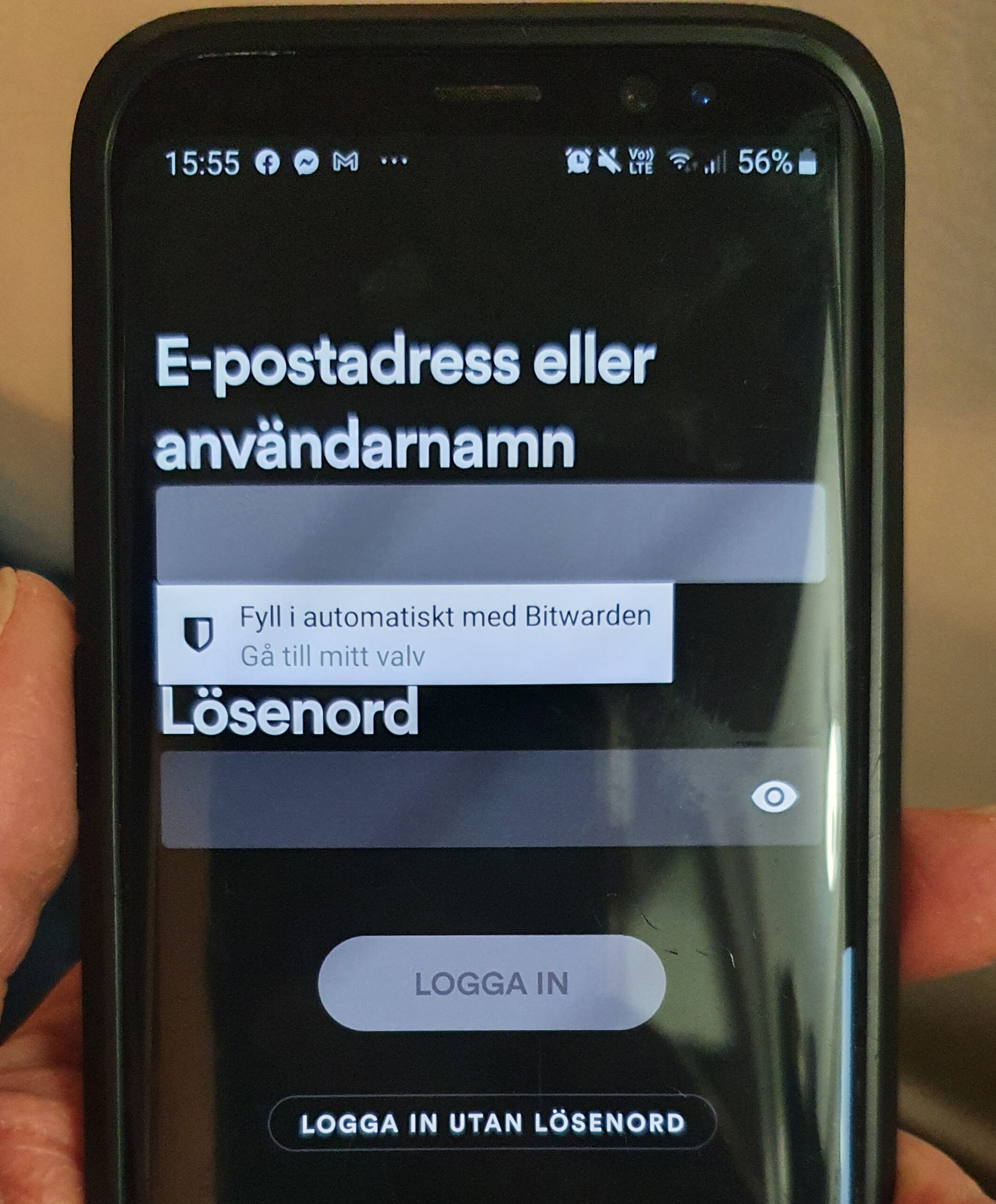 För att testa att det fungerar så använder du webbläsaren på telefonen och besöker en tjänst där du inte har varit inloggad tidigare men som ligger inlagd i Bitwardens valv. Klicka på Bitwarden-autofyll texten som dyker upp och välj rätt uppgifter. Bitwarden funkar också på vanliga appar på telefonen som till exempel på Spotify.