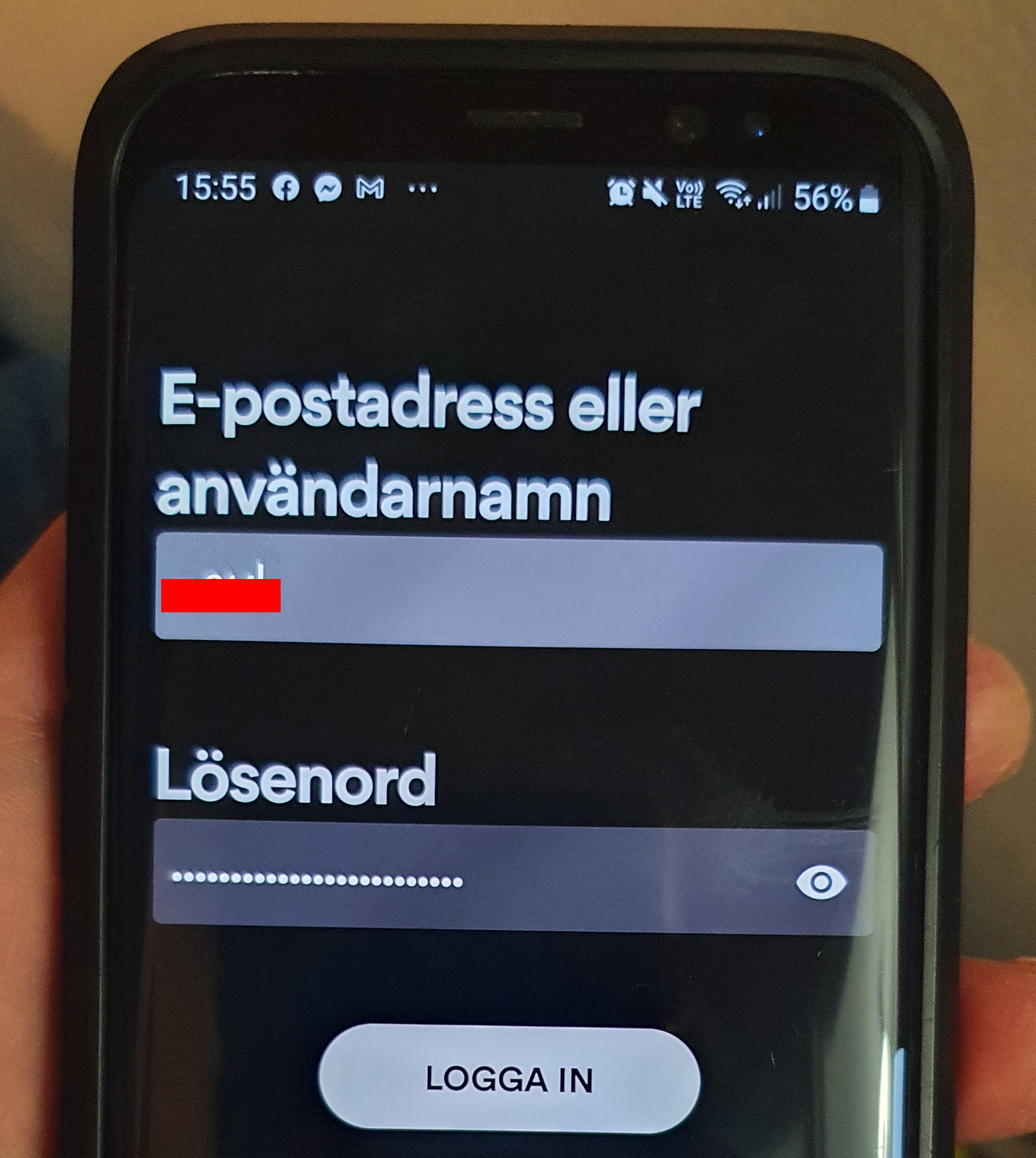 Mina uppgifter autofylls till Spotify och jag trycker på ”Logga in”.