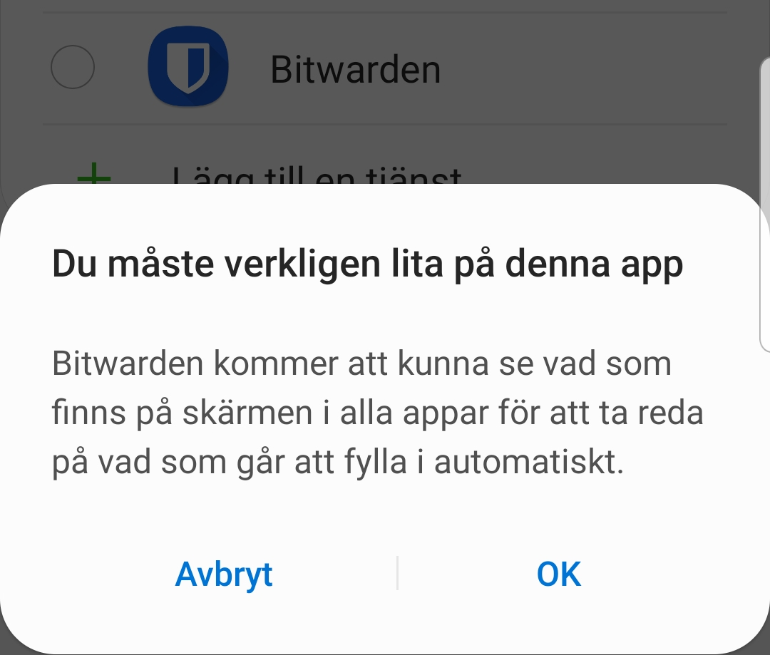 När du loggat in så behöver du godkänna Auto Fill-inställningar på en Android-telefon för att den ska kunna föreslå att autofylla lösenord för dig. Öppna inställningar i appen och godkänn de olika alternativen. Du kommer då omdirigeras till systeminställningar där du behöver godkänna att Bitwarden-appen får tillgång till de rättigheter som behövs för att “lägga sig över” en annan app.