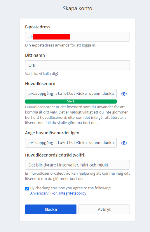 Kolla sen din inkorg för en verifieringslänk. Klicka på den. Det kan hända att mejlet hamnat i spamfilter eller dylikt, om du inte hittar det så prova att söka efter “bitwarden” i din mejlklient.