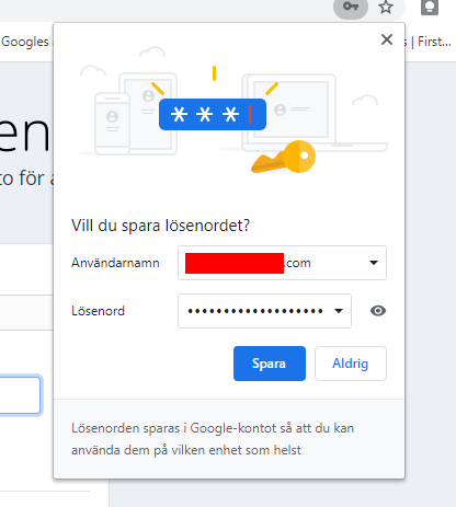 Beroende på dina inställningar och vilken typ av webbläsare du använder så kommer du eventuellt få en fråga om huvudlösenordet till Bitwarden ska sparas i webbläsaren. Jag väljer “Aldrig” för att undvika att lösenordshanterarens lösenord hanteras av webbläsaren.