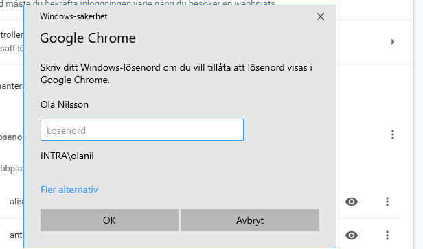 Om du klickar på det lilla ögat kan du se lösenordet i klartext när du väl loggat in med datorns lösenord. Lösenorden i webbläsaren kan du radera efter ett tag när du är komfortabel med användandet av lösenordshanteraren och allt flyter på som det ska.