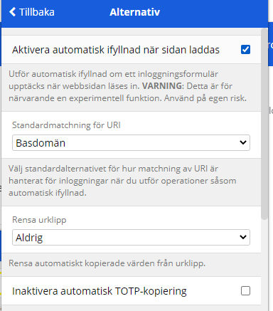 Bitwarden innehåller en experimentell autofyllfunktion som fungerar ungefär på samma sätt som webbläsarens. När du kommer till en sida så autofylls uppgifterna om de finns i valvet. Denna funktion hittas under Inställningar -> Alternativ -> “Aktivera automatisk ifyllnad när sidan laddas”