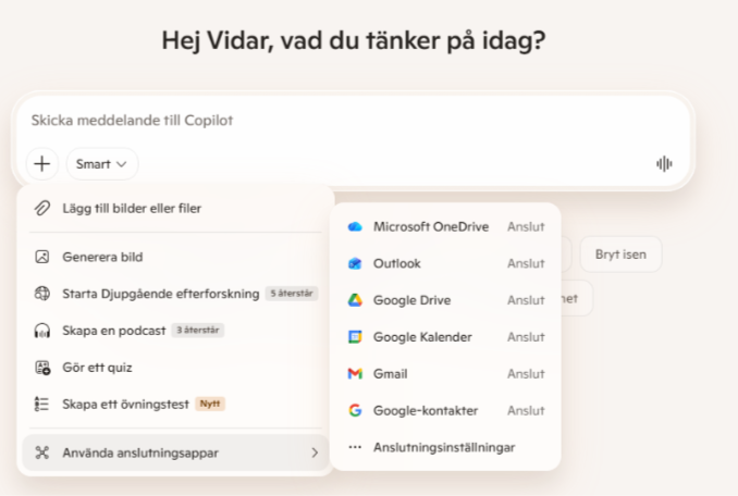 I mitten hittar du själva chattfönstret. Där skriver du dina promptar. Klickar du på knappen där det står ”Smart” kan du välja vilket läge du vill aktivera: Smart eller Djupgående reflektion, Studera och lär dig, och Sök. Studera och lär dig aktivera ett pedagogiskt läge. Sök är framför allt optimerat för när du vill göra informationssökning på webben. Smart är bara standardläget och djupgående reflektion så kommer modellen att ta lite längre tid på sig och resonera, vilket ger ett bättre svar om du ger den en lite mer komplex uppgift att jobba med.