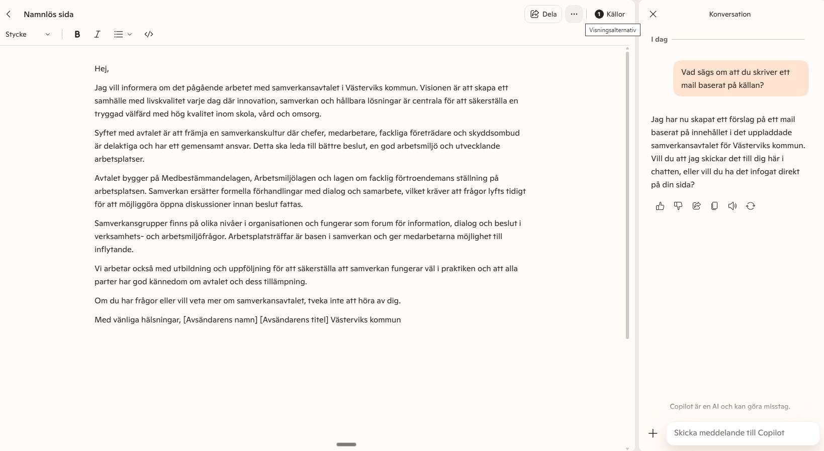 Du kan också välja att ladda upp källor och sedan växla läge längst upp till höger mellan källor och konversation. I chattfönstret kan du sen exempelvis instruera Copilot att producera text till din sida baserat på dina källor.