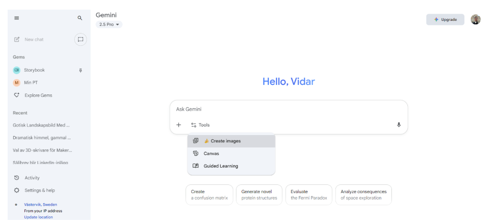 Bredvid sidomenyn hittar du också platsen där du kan välja vilken modell du vill använda dig av under rubriken Gemini. Som gratisanvändare har du begränsad tillgång till Pro-modellen.
