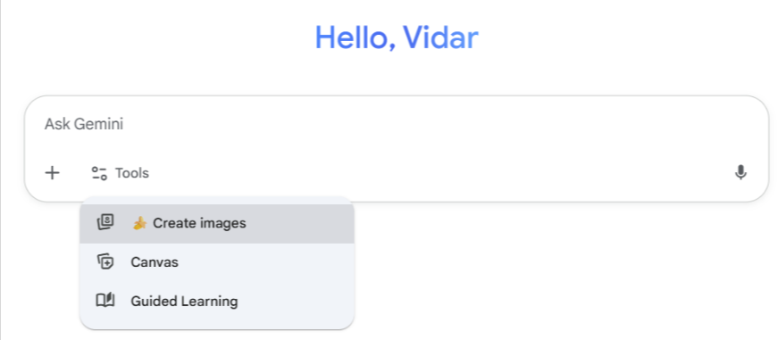 I chattfönstret ser du också ett par ikoner. Plustecknet (+) låter dig ladda upp filer som du kan använda i chatten för att exempelvis be Gemini sammanfatta eller förklara. Du kan ladda upp filer från datorn eller från ditt Google Drive-konto. Deep Research använder du om du vill låta Gemini skapa en mer djupgående rapport inom ett ämne. Då kommer den att både använda mer beräkningstid och hämta information från nätet. Guidad inlärning aktiverar ett pedagogiskt läge där Gemini inte kommer att svara direkt på dina frågor, utan snarare vägleda dig fram till svar. Perfekt också för att skapa quiz och läxförhör.