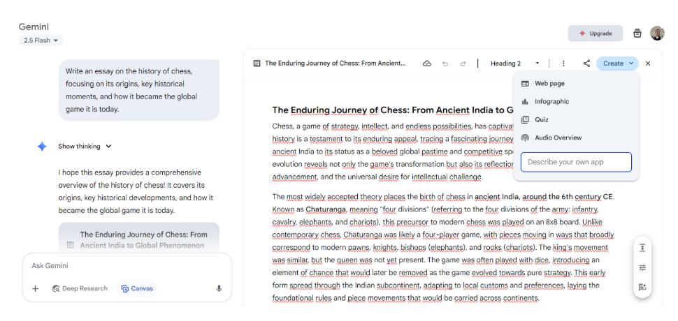 Canvas är Geminis textredigeringsverktyg som låter dig arbeta med kod eller text. Där kan du exportera det du skapat direkt. Genom att använda Dela-knappen kan du också välja att skapa den text som du gjort som en hemsida direkt med HTML-kod, eller en infografisk bild, eller ett quiz, eller en ljudöversikt i form av en samtalspodd. För dig som vill använda Gemini för att skapa text är det här ett mycket användbart verktyg. Men det kräver lite testande innan man bemästrar det.