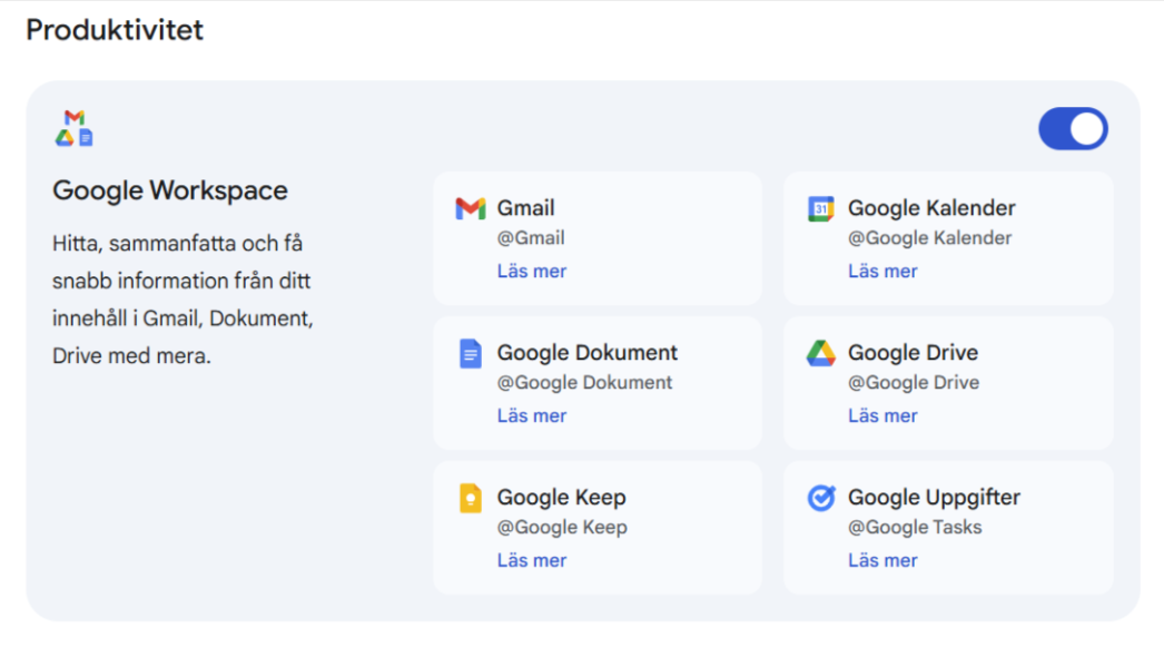 Du kan aktivera och avaktivera dessa tillägg för att kontrollera vilken information Gemini har tillgång till.