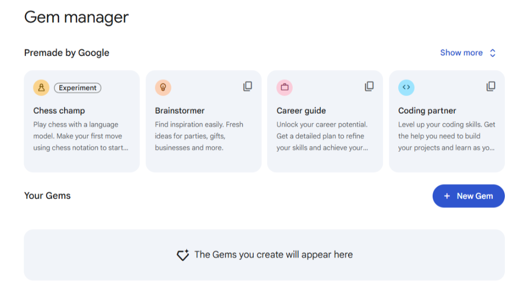 Motsvarigheten till ChatGPTs projekt kallas i Gemini för Gems. Du hittar dem i den vänstra fliken, precis under “Starta ny chatt”. Med Gems kan du använda anpassade chattbottar som andra personer har skapat. Men om du klickar på plustecknet med ”New Gem”, så kan du skapa din egen specialanpassade chattbot.