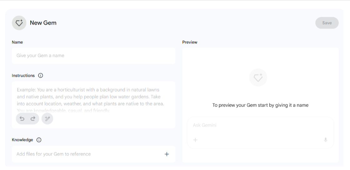Då får du upp en ny ruta där du kan namnge din Gem. Du kan ge den specialanpassade instruktioner, vilket fungerar som en prompt som ständigt är aktiv. Du kan lägga till en kunskapsbas i form av uppladdade filer från din dator eller filer som du länkar in från ditt Google Drive-konto. Kunskapsbasen blir sedan dokument som din Gem kan söka igenom och analysera när du chattar med den. Den fungerar inte perfekt, på så vis att den kan ha exakt koll på all information som finns i dina dokument. Detta beror på hur stora dina dokument är, hur många tokens de motsvarar och hur många tokens Gemini kan hantera i en konversation.