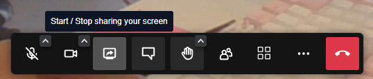 Nere i det verktygsfältet hittas också skärmdelningsfunktionen som är förnämlig om du vill visa något på din skärm för de andra mötesdeltagarna. Välj om du vill dela hela skärmen, något av dina programfönster eller en specifik flik i webbläsaren. Glöm inte att avsluta delningen när du är färdig!
