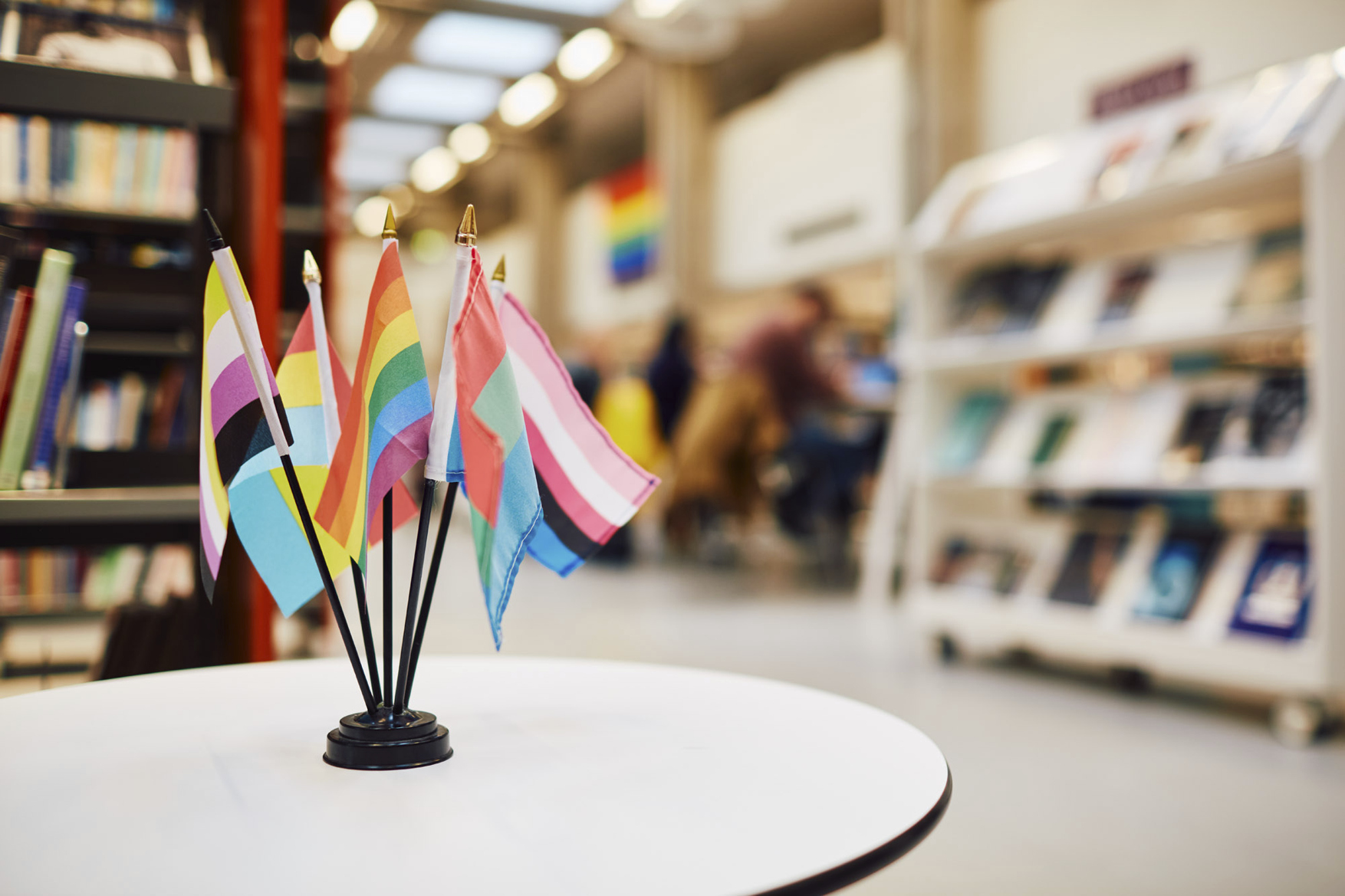 Att hänga upp regnbågsflaggor i biblioteksrummet är ett sätt att signalera till både besökare och personal att biblioteket är en öppen och inkluderande plats. Regnbågsflaggor kan finnas i många olika former på bibliotek. Det kan vara alltifrån små klistermärken på bokryggar till stora fasadflaggor.