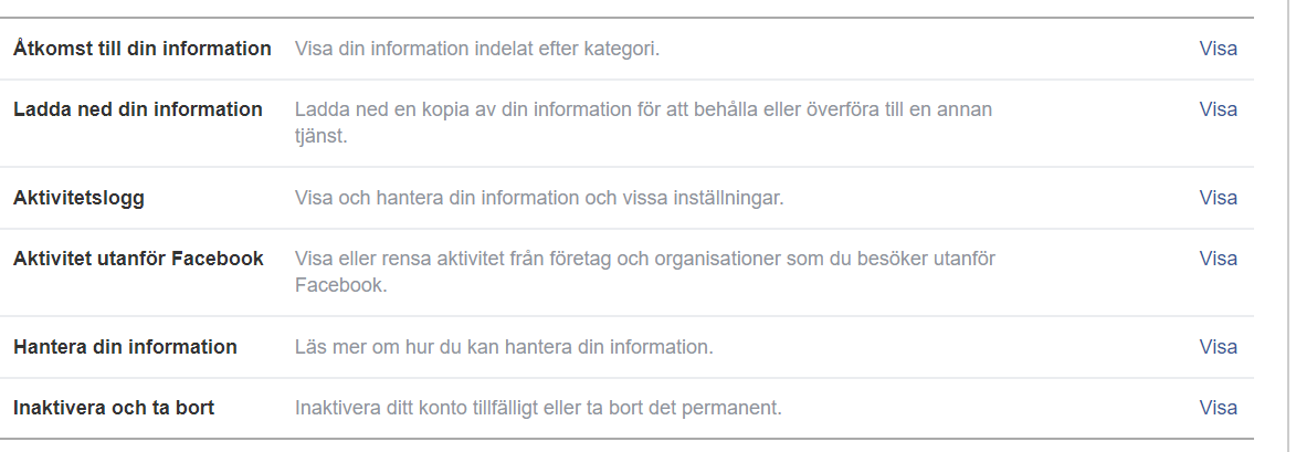 Vill du se vilken data som sparats av dig kan du ladda ner den. Du hittar den under ”Inställningar” och sen ”Din Facebook-information”.