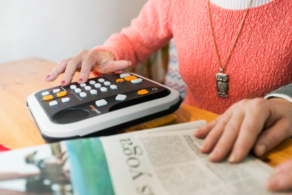 På bilden syns en daisyspelare, genom vilken man kan lyssna på daisyböcker. Formatet daisy är framtaget för att underlätta för personer att navigera enklare och snabbare i talböcker. Foto: Apelöga ©