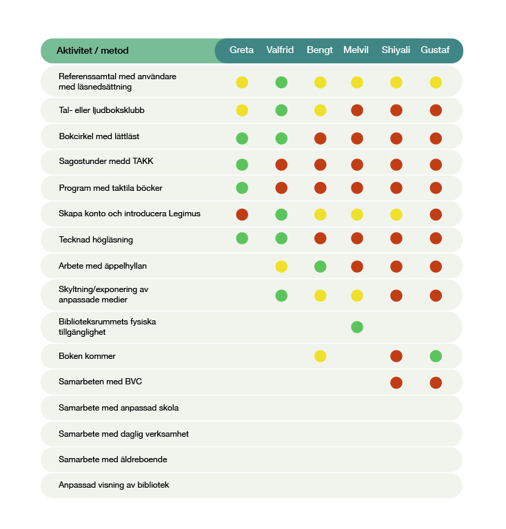 Ett sätt att få syn på vad ni på ert bibliotek gör när det gäller att förmedla läsning och arbeta med läsfrämjande för och med personer som möter läshinder, är att göra en kartläggning av medarbetarnas olika arbetsuppgifter.
