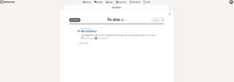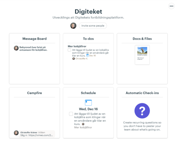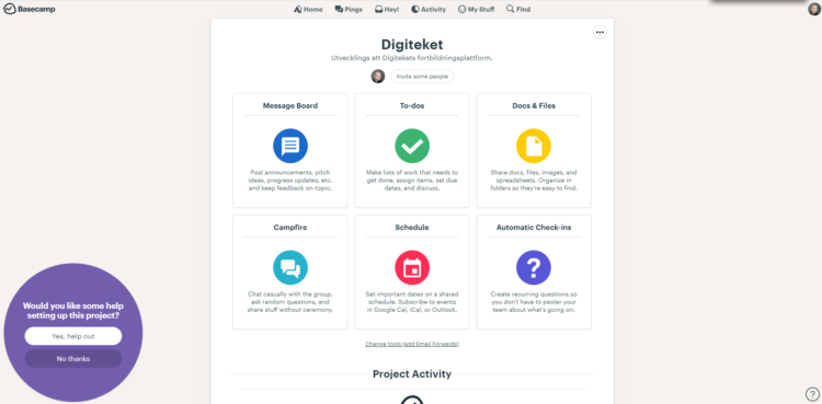 Basecamp erbjuder grundläggande projektfunktioner i ett enkelt litet paket. Du kan snabbt få överblick över hela projektet och alla funktioner för projektet som programmet erbjuder. Det lämpar sig mycket bra för projekt för en begränsad mängd människor men kanske inte räcker till om projektet blir för omfattande. Den avgränsade mängden funktioner gör att alla snabbt kommer att lära sig att använda programmet men det finnsfärre möjligheter att anpassa och bygga ut verktyget.
