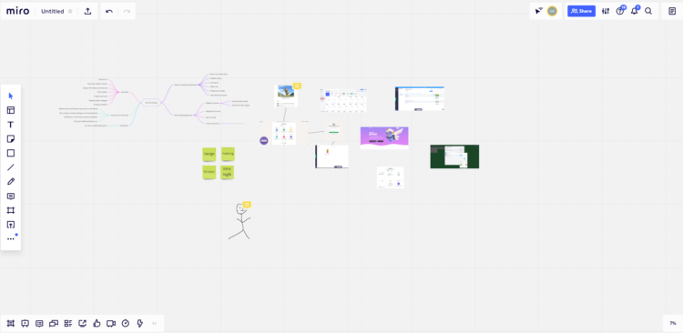 Miro erbjuder en mycket omfattande och flexibel whiteboard där du digitalt kan göra det mesta du kan göra med en analog anslagstavla – och en hel del därtill. Du kan måla på frihand, posta bilder och tabeller, sätta upp post-it-lappar, brainstorma och mycket mer.