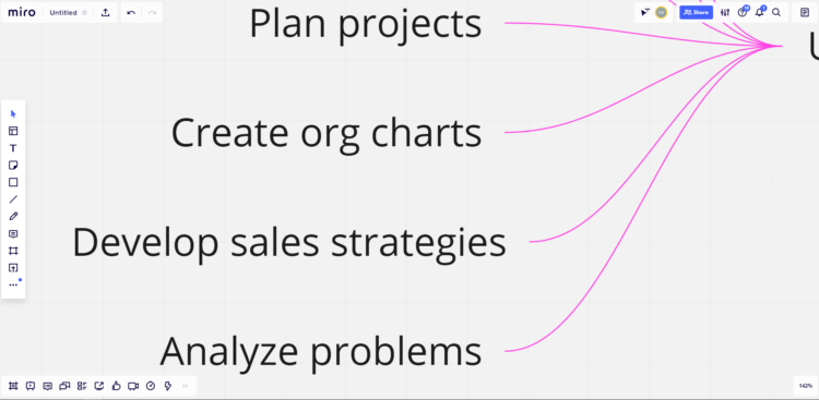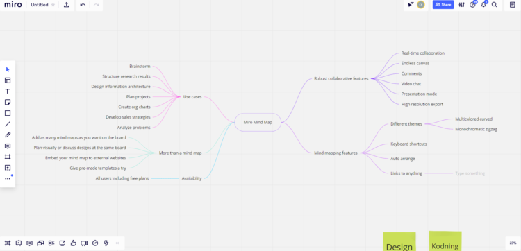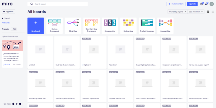 Miro är ett program som ger användarna en mycket avancerad digital whiteboard att jobba med. Det är ett verktyg som finns i flera nivåer: från en gratisversion med begränsade möjligheter till flera olika betalnivåer med olika sorters funktionalitet.