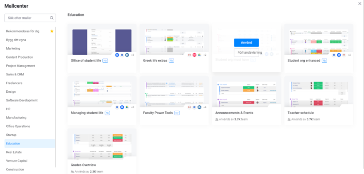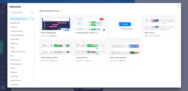 Din första uppgift på monday.com blir därför att välja vilka sorters verktyg just ditt projekt behöver. Detta görs bäst genom att börja med den myriad av färdiga mallar som tillhandahålls – och sedan göra justeringar därifrån. I menyn erbjuds mallar för väldigt många olika sorters funktioner och varje funktion har sin egen samling specialiserade undermallar.