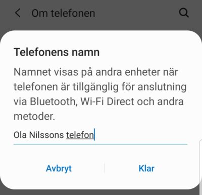 Du kanske vid något tillfälle ”döpt” din telefon för Wi-Fi, Bluetooth eller med ditt namn. Det betyder att “Majas telefon” är vad som syns för ägaren av Wi-Fi-nätverket och, om din Bluetooth är påslagen, för alla i närheten som också har sin Bluetooth påslagen.