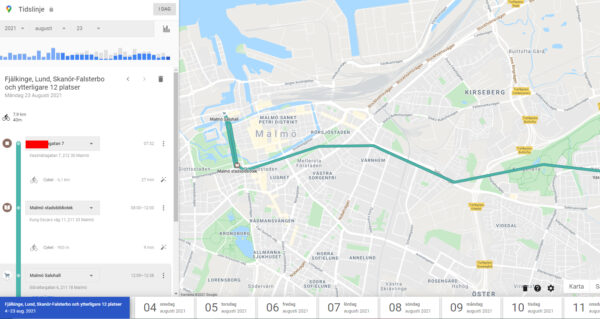 På denna tidslinje kan du följa alla resor du gjort och om du haft platstjänster igång samt varit inloggad på ditt Googlekonto. På bilden nedan kan Ola på Digiteket, och Google förstås, se vilken väg han cyklat till jobbet men också att han gjort en liten avstickare till Saluhallen för lunch.