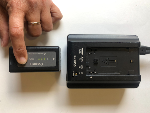 Ta för vana att se efter hur laddat batteriet som sitter i kameran är genom att titta i kamerans display där det ofta anges på samma sätt som för en mobiltelefon. Vissa kameror, likt vår exempelkamera, visar också direkt på batteriet hur mycket laddning som finns. Kontrollera detta före inspelningen och ladda upp det vid behov. Det kan vara svårt att förutsäga hur snabbt ett batteri blir urladdat, det är därför bra att ha tillgång till två batterier. Skulle ditt ena batteri bli urladdat kan du använda det andra och sätta det första på laddning medan du spelar in. På så sätt vet du att batteritillgång inte kommer att vara ett bekymmer under inspelningen.
