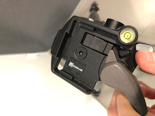 Fäll ut benen på stativet och spänn fast dem. Spänn fast kameran genom att hålla ner stativhållaren som bilden ovan visar och känn efter att du fäst den ordentligt. Justera stativets höjd vid behov och använd stativets vattenpass för att få stativet rakt.