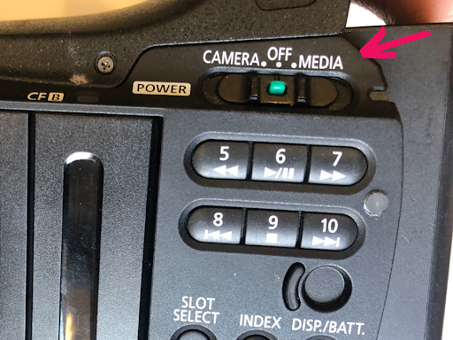 Nästa steg blir att se efter hur mycket minne som finns kvar på korten. På skärmens display bör du kunna se hur mycket inspelningstid det finns kvar. Skulle du se att tiden inte kommer att räcka till bör du radera gammalt material. För att radera materialet behöver du trycka på knappen som ändrar från ”Camera” till ”Media”. Du kommer på så sätt att se minneskortens innehåll på skärmen och kunna välja om du vill radera vissa eller alla inspelningar.