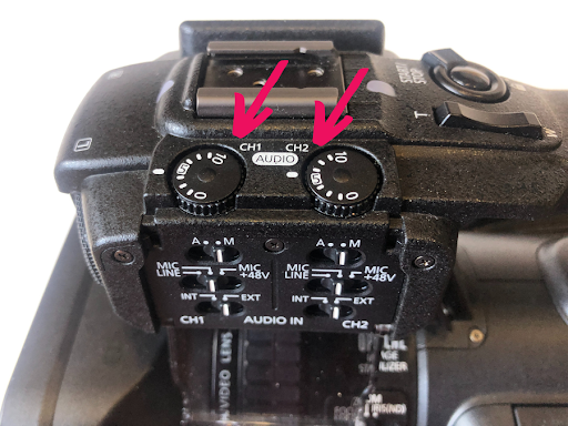På samma sätt som för bilden kan man välja mellan automatiska eller manuella inställningar för de två ljudkanalerna. Välj ”M” för manuellt. Detta innebär att du själv kan styra ljudvolymen. Rekommendationen är att du väljer manuell. Fördelen är att du kan göra en soundcheck före inspelningen med personen framför kameran och då ställa in rätt ljudnivå. Nackdelen är när det är flera personer framför kameran, då blir det svårt att ställa in rätt ljudnivå på alla, och då kanske det är bättra att välja automatisk. Välj ”MIC” för mikrofon. LINE används om du till exempel ska få in ljudet från ett mixerbord eller dylikt och ”MIC +48V” är så kallad fantommatning och används till mikrofoner som kräver strömförsörjning. Välj ”EXT” för att välja den inkopplade mikrofonen och inte det interna ljudet från kamerans egen mikrofon (INT).