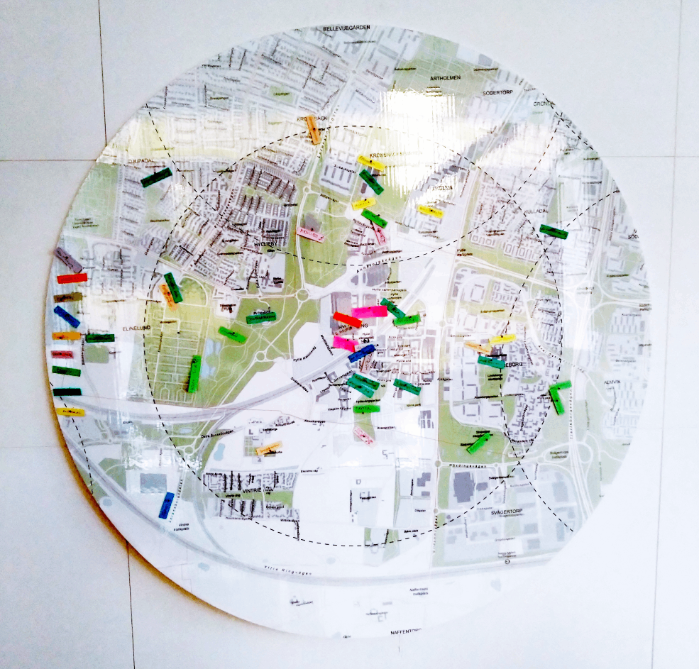 Om man nu närmar sig samverkan från den här utgångspunkten, ja då kan man ju börja med att titta på hur er omgivning ser ut. Och här har vi ett supersmart sätt som kommer från biblioteket i Hyllie i Malmö. De tog fram en karta och sen började de undersöka vilka föreningar, organisationer och verksamheter som finns i närområdet.