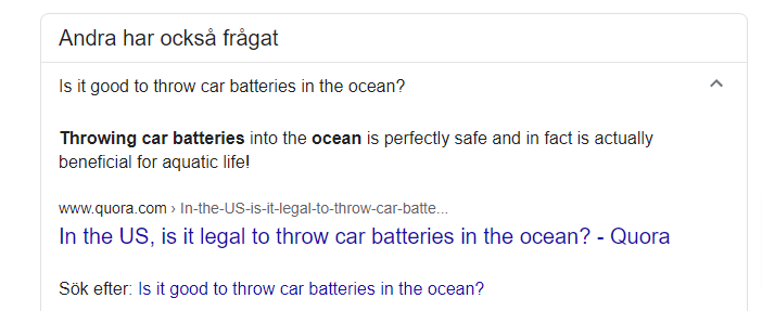 Google har också en frågefunktion där svar på frågor presenteras i en ruta. Här nedan har algoritmerna uppenbarligen valt att lyfta fram ett skämtsvar på frågan om det är bra att slänga bilbatterier i havet.