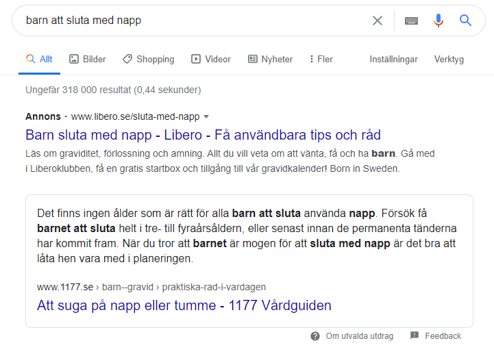 I exemplet nedan har Googles algoritmer valt ut ett svar från 1177 på sökfrågan om hur man får barn att sluta med napp vilket i sammanhanget får betraktas som en auktoritet och här fungerar funktionen som det är tänkt. Du får ett “bra” svar från en auktoritativ källa och du behöver i princip inte söka dig längre ner bland sökresultaten.
