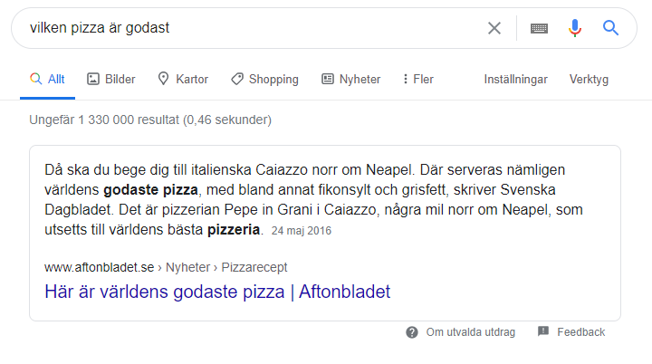 Alla frågor får dock inte lika underbyggda och definitiva svar. Även på en svårare och mer subjektivt formulerad fråga som “vilken pizza är godast” så försöker algoritmerna hitta ett svar. I detta fallet i form av ett utdrag från en Aftonbladetartikel från 2016. Ett svar som troligtvis ingen har någon direkt nytta av.