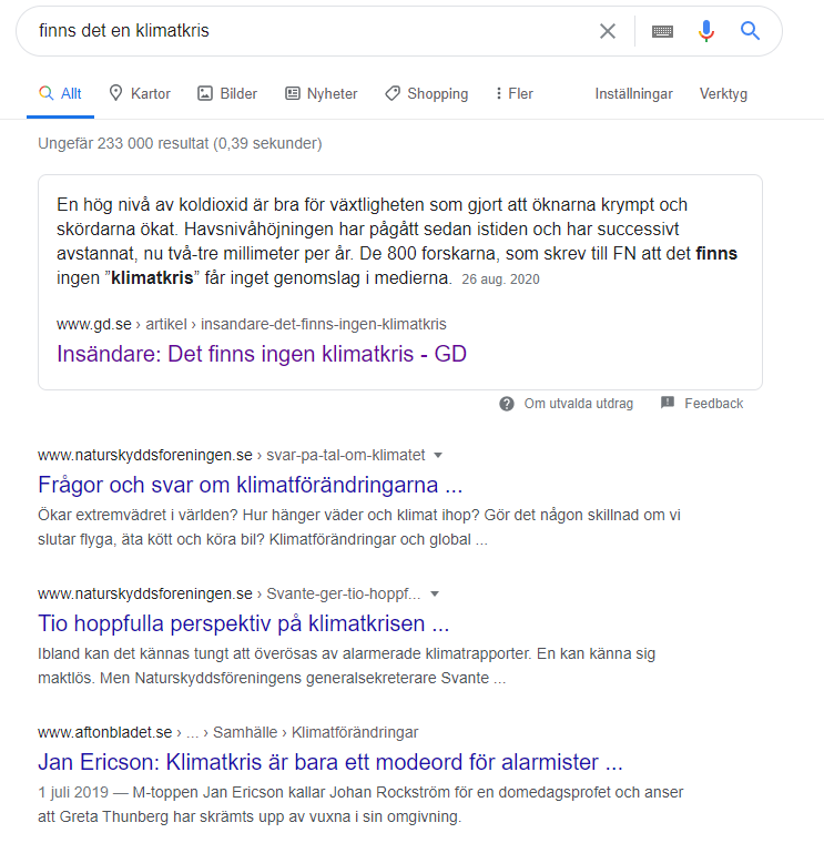 Vi ställer frågan “finns det en klimatkris” till Google. En fråga vars svar hela världens forskare är eniga om och som sökjätten inte borde ha några problem att besvara. Vad väljer då Google ut för källa som då blir presenterad som auktoritet i detta fall?